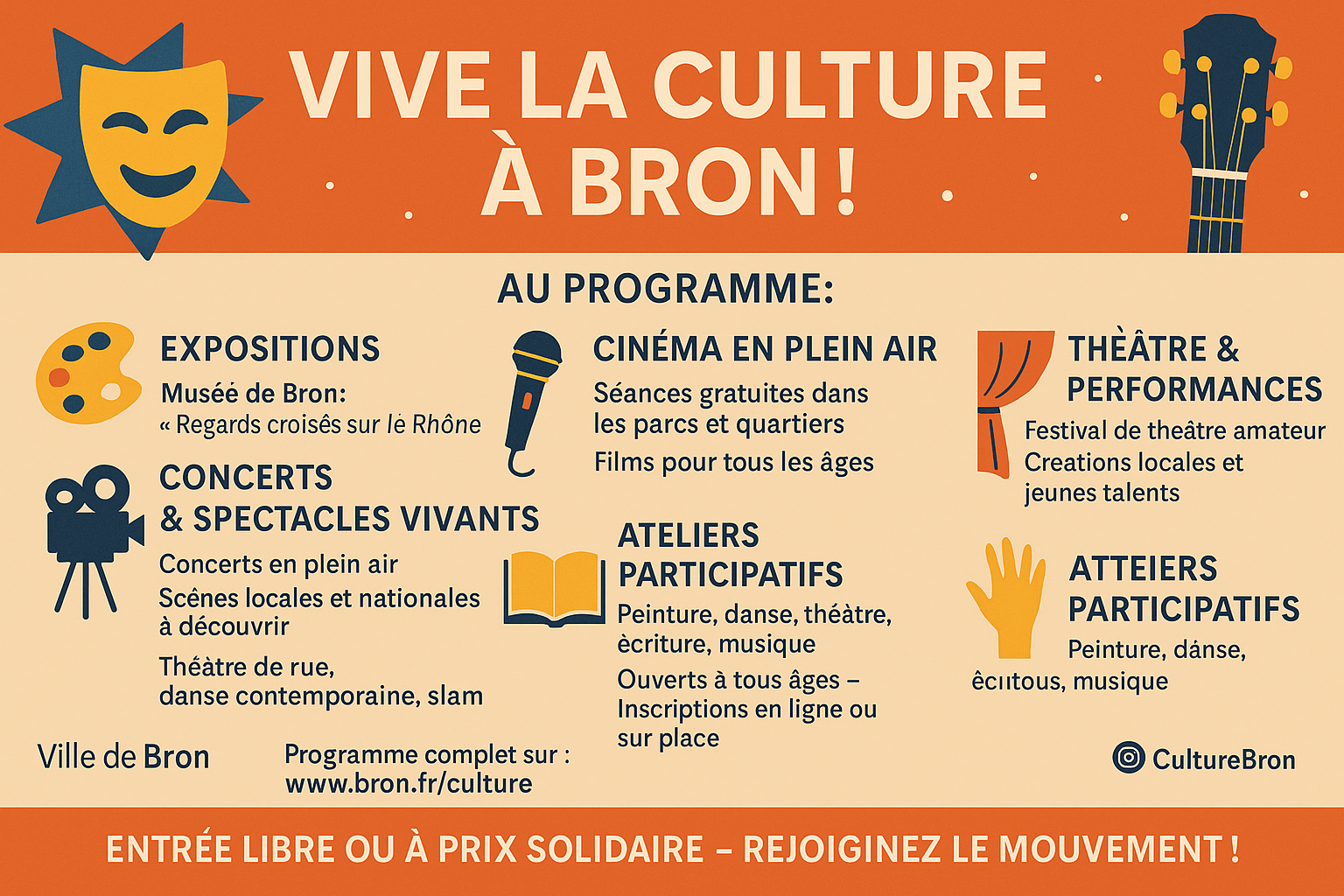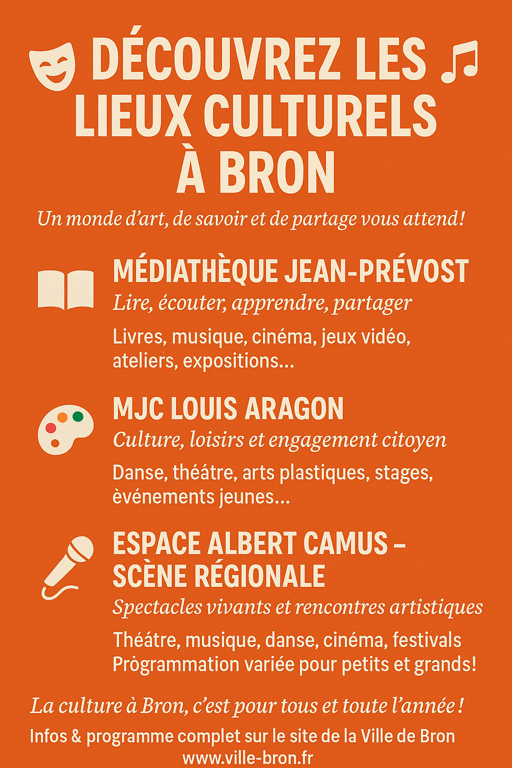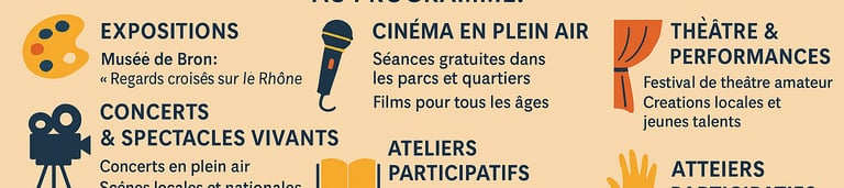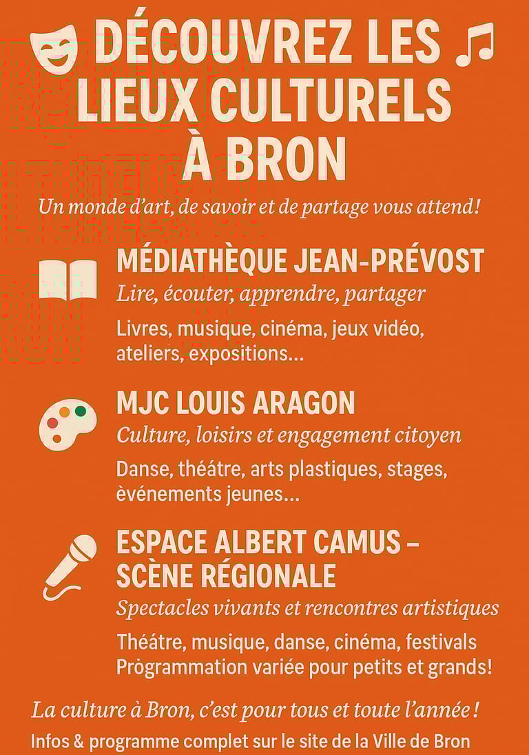Bron se distingue par une offre culturelle dense, innovante et fédératrice, portée par des équipements de qualité, des festivals renommés et une forte implication des habitants et des associations. Que ce soit pour la danse, la littérature, le cinéma, la musique ou les arts visuels, chacun peut y trouver de quoi nourrir sa curiosité et son envie de découverte